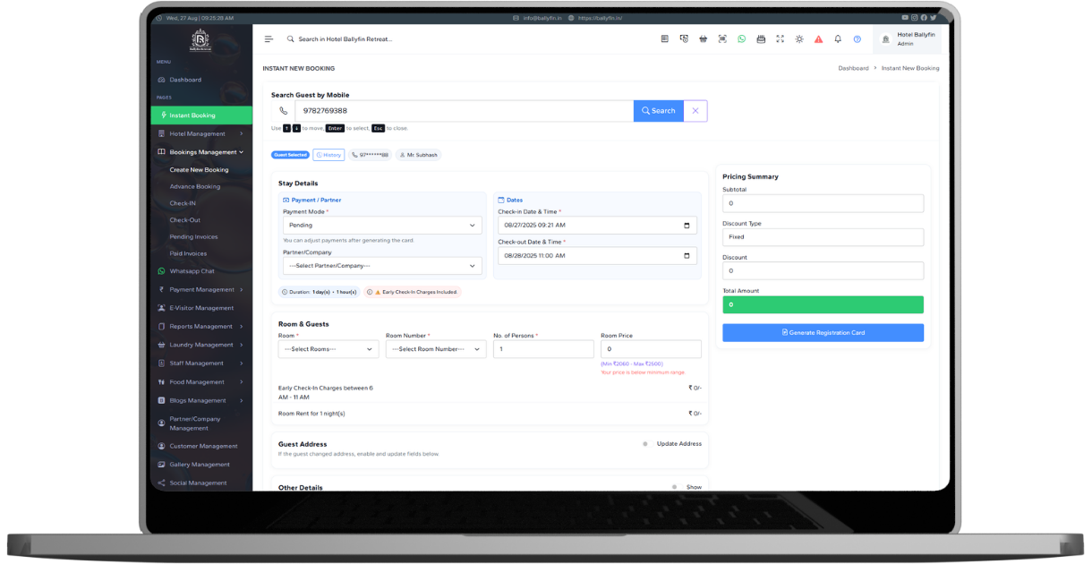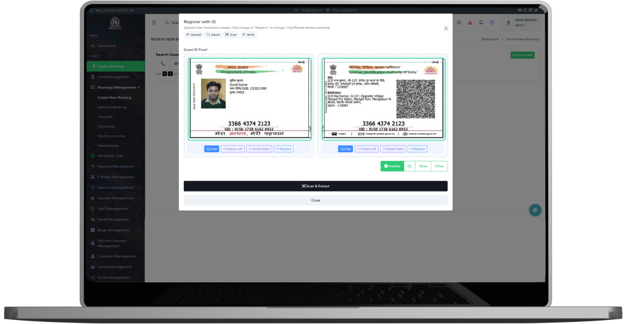 With integrated ID scanning, your staff can extract guest details directly from Aadhaar or other government IDs. No more manual typing or errors — bookings become faster and more accurate. This automation saves time, speeds up the booking process, and ensures a seamless guest onboarding experience. Even during peak seasons, your staff can handle multiple reservations effortlessly.