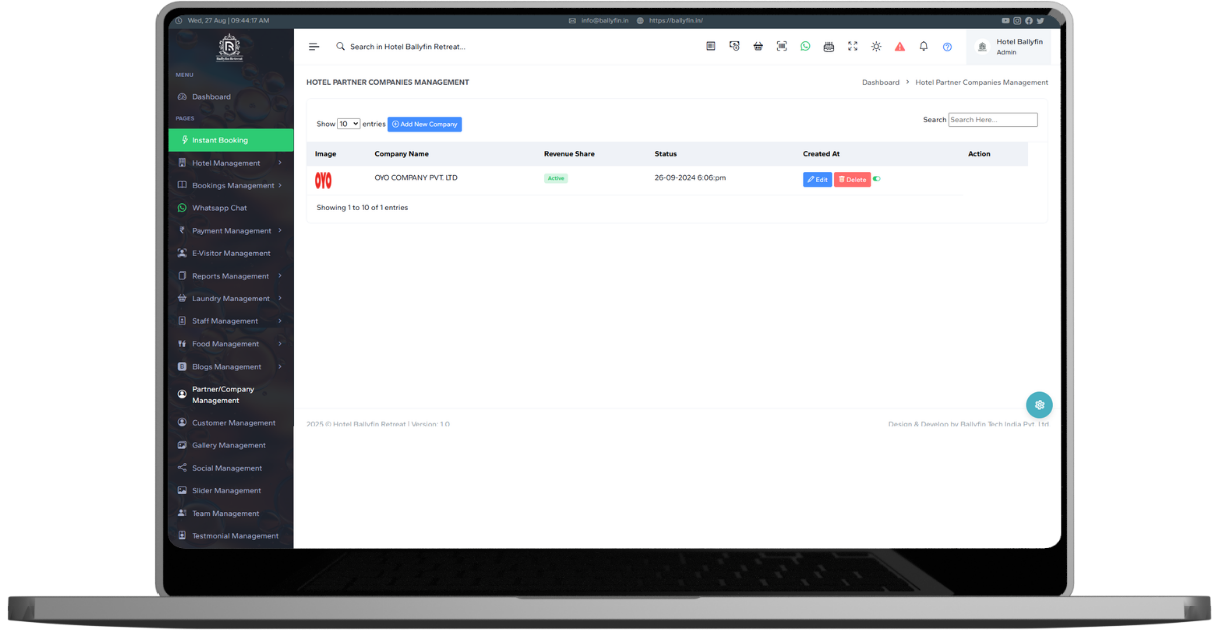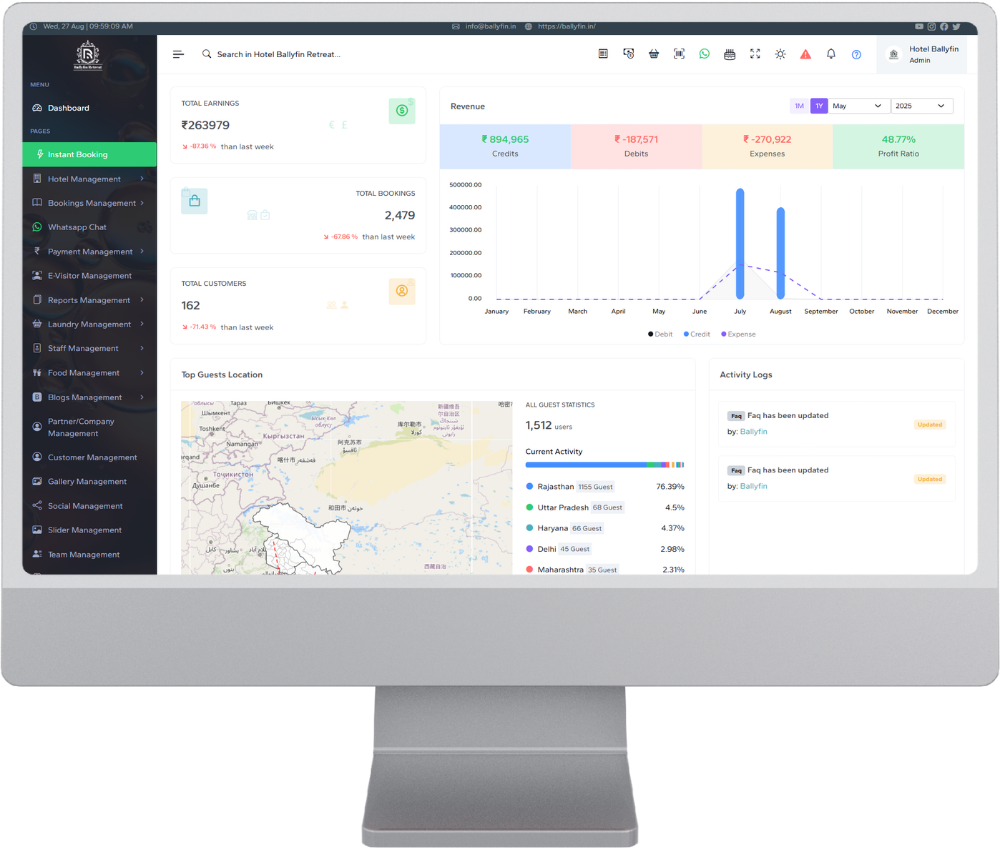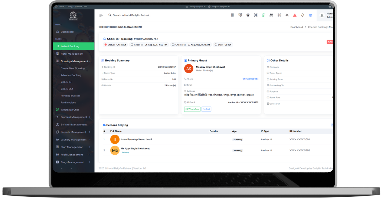 Tez Pravesh is a next-generation Hotel Management System developed by Ballyfin Tech India Pvt. Ltd. with a vision to simplify and modernize hotel operations. Our platform helps hotels manage bookings, check-ins, billing, food services, laundry, and OTA integrations — all from one easy-to-use dashboard.